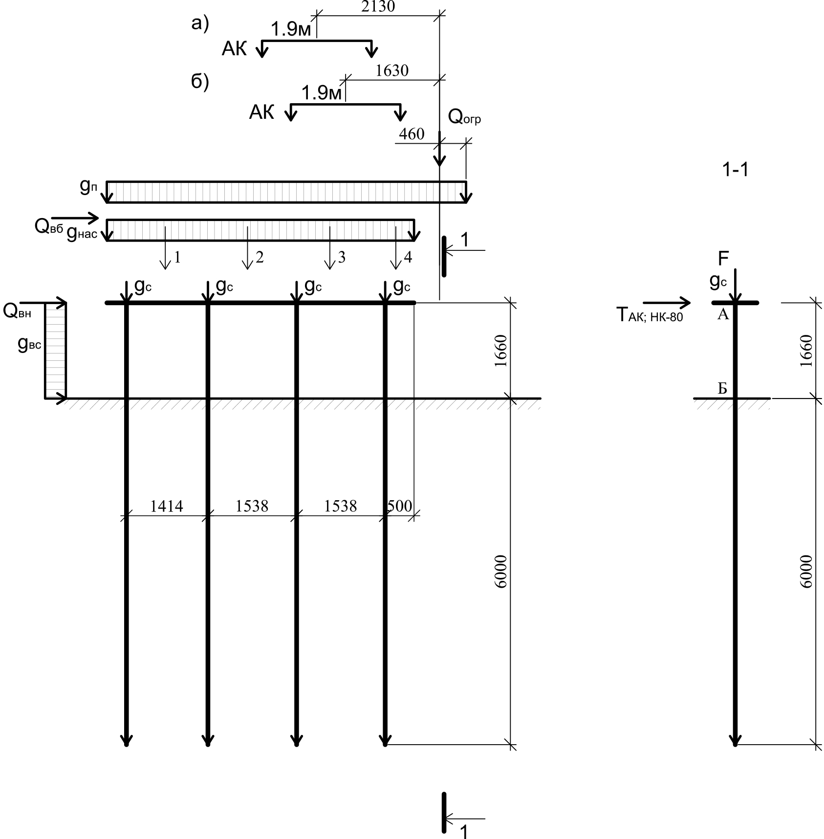 На первой стадии выполняют расчёт существующего моста при пропуске временной нагрузки АК класса 10 на половине пролетного строения. В такой схеме часть элементов фактически не участвует в работе, и расчёт ведут с учётом того, что половина свай и насадки в восприятии усилий не задействованы.