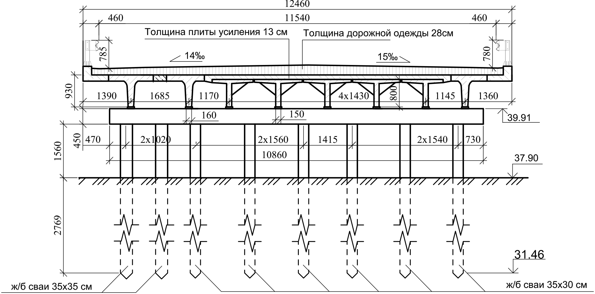 Поэтому расчёт выполняют поэтапно: отдельно проверяют существующий мост на период монтажа (с учётом изменения потока движения и временных схем пропуска), затем проверяют схему после реконструкции для новой эксплуатационной стадии. Если по результатам этапных проверок запас несущей способности оказывается недостаточным, прорабатывают усиление или новый фундамент.