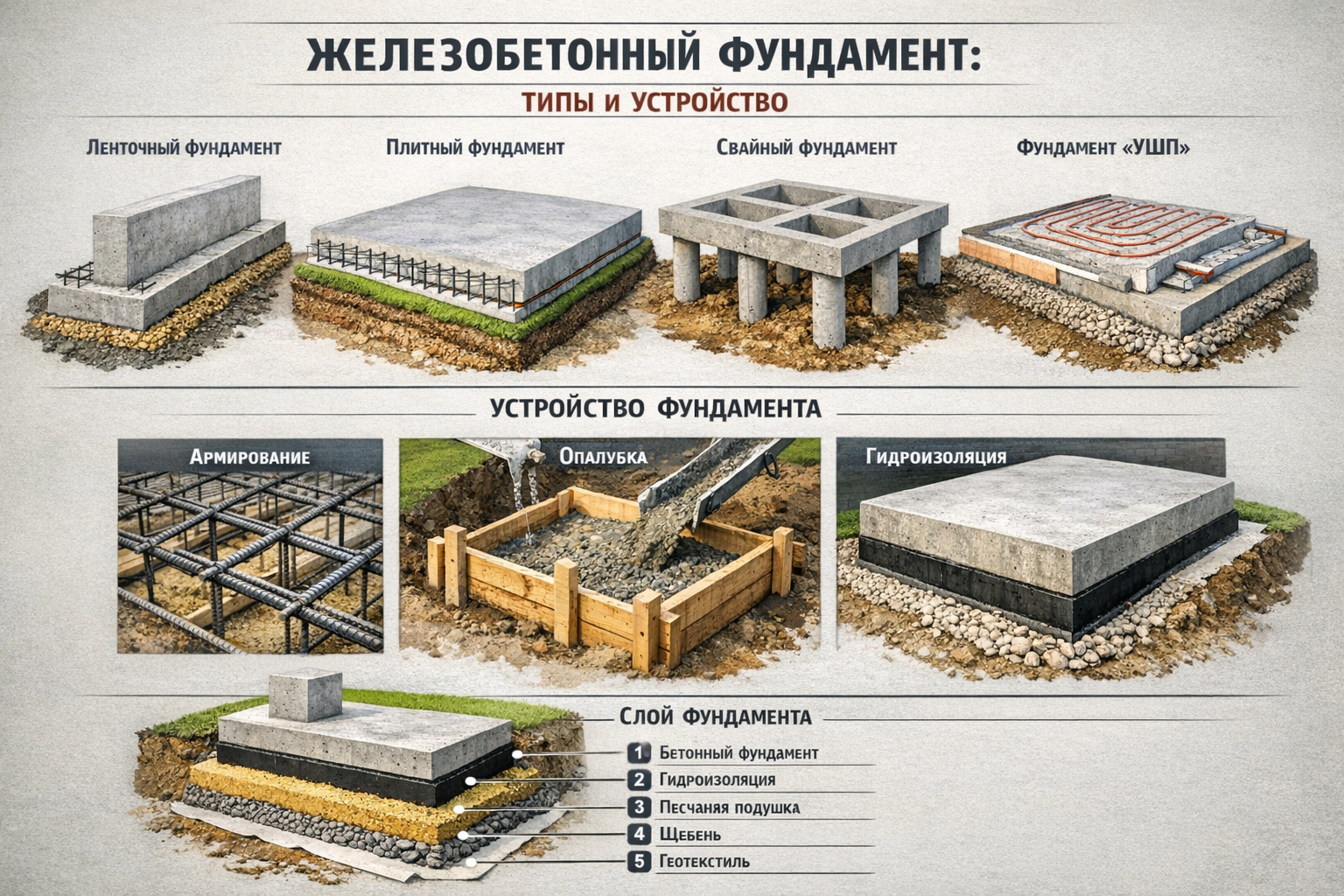 По типу конструкции классифицируют три основных варианта оформления фундамента: